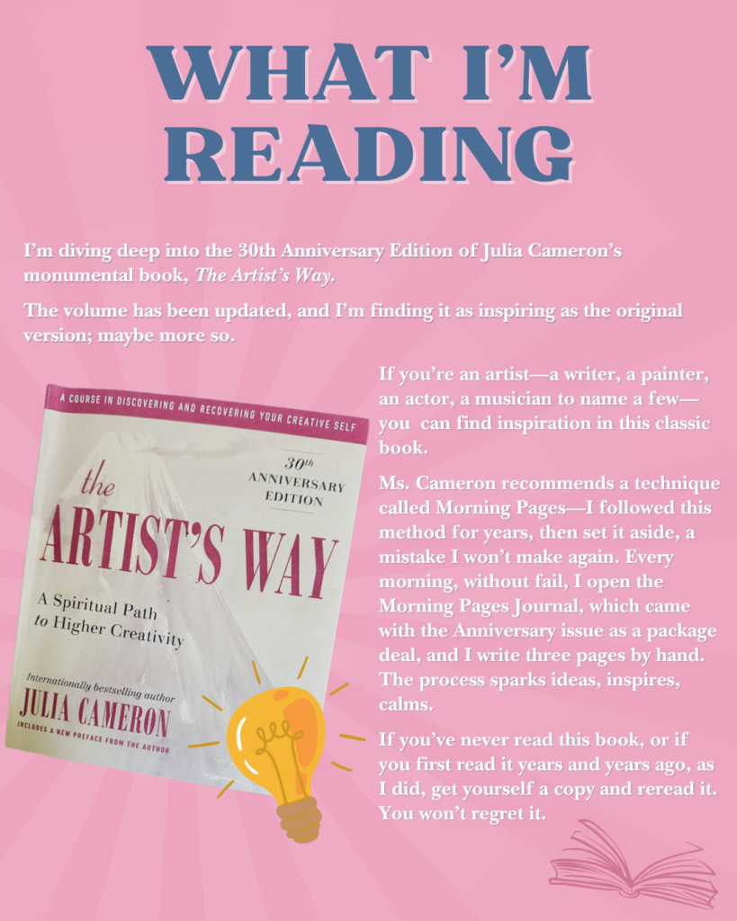 As I write this, I’m recovering from a nasty cold. I’ve spent the last few weeks grappling with this—ironically, it started as soon as I finished my 6-week round of TMS treatments–but I’m getting better, however slowly. Last week, I mentioned Julia Cameron’s marvelous book, “The Artist’s Way”, which I originally read three decades ago,…